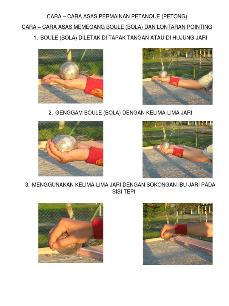 Aturan yang digunakan dan juga Cara memulai permainan olahraga petanque. Permainan petanque boleh dimaikan dengan 3 cara. CARA-CARA ASAS MEMEGANG BOULE BOLA DAN LONTARAN POINTING BOULE BOLA DILETAK DI TAPAK TANGAN ATAU DIHUJUNG JARI GENGGAM BOULE.